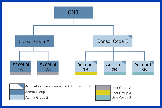 | • | People in Admin Group 2, User Group X and User Group Z cannot see Consol Code A or accounts 1A and 2A. Similarly, people in User Group X can only see account 1B and people in User Group Z only see accounts 2B and 3B. |